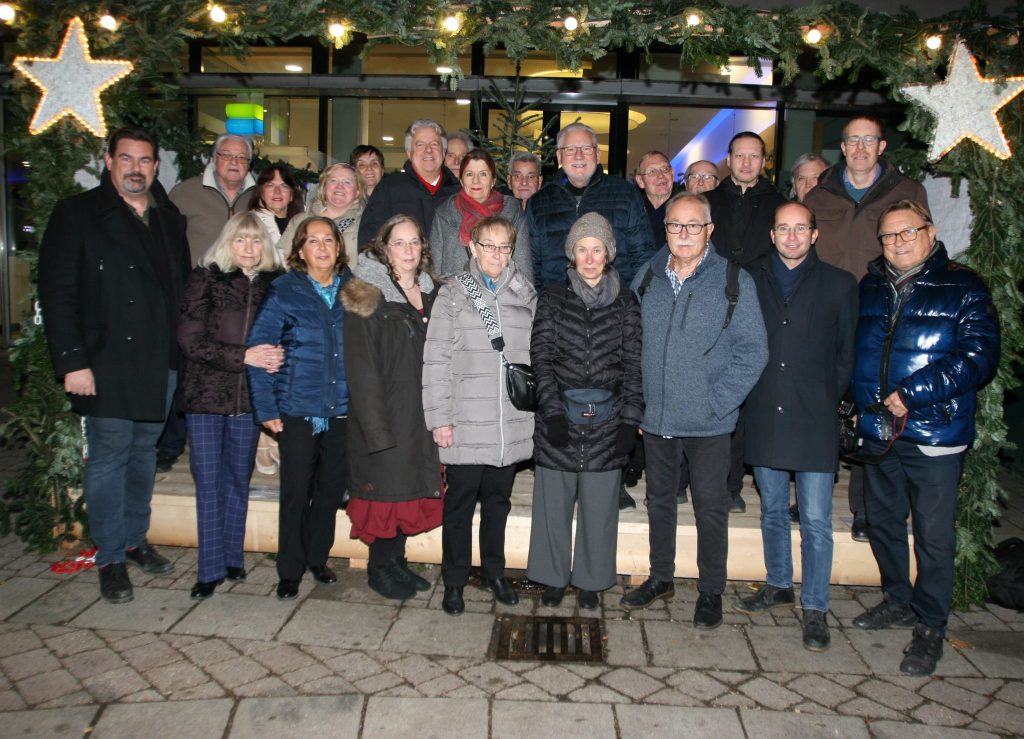 Teilnehmer der Fahrt nach Purkersdorf im Dezember 2025 mit den Freunden aus Purkersdorf auf der Bühne des Weihnachtsmarktes
